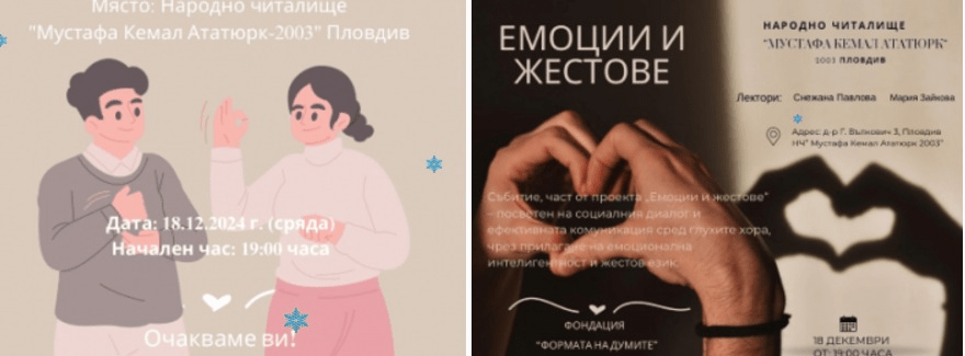 Проектът е посветен на социалния диалог и ефективната комуникация сред глухите хора чрез прилагане на емоционална интелигентност и жестов език. Програмата включва семинари, обучения и практически работилници с акцент върху разпознаване на емоциите, лицевите изражения и езика на тялото.