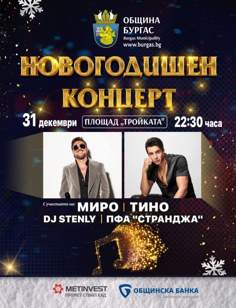 Община Бургас и тази година подготвя празничен концерт, с който да зарадва всички жители и гости на града. За да отброява с бургазлии последните минути до Новата 2025 година, на сцената до празничната елха ще се качи изпълнителят с въздействащ тембър Кирил Хаджиев – Тино. Веднага след него ще изгубим контрол от добро настроение с хитовете на друг неповторим и любим глас – Миро.