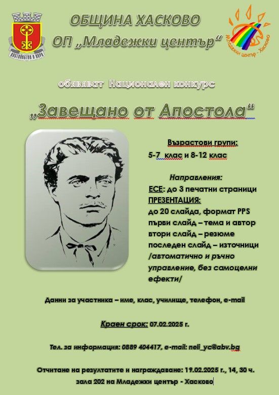 Община Хасково и Младежки център #Хасково обявяват 15-ти Национален конкурс „Завещано от Апостола“. Конкурсът е посветен на 152 години от гибелта на Васил Левски.